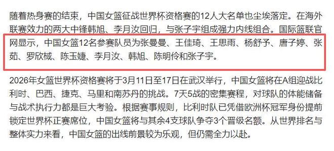 - 10點官宣!中國女籃12人名單出爐:楊舒予、李月汝、王思雨領銜