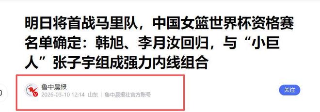 魯中晨報2026-03-10《明日將首戰馬裏隊,中國女籃世界杯資格賽名單確定:韓旭、李月汝回歸,與“小巨人”張子宇組成強力內線組合》