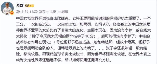 本次世預賽,中國女籃的外線表現難以讓人滿意,對陣捷克隊一役,全隊三分球21投僅6中,命中率低至28.6%。名嘴蘇群直言,如今的中國女籃與2022年世界杯亞軍陣容相比,最大的變化就是缺少了李夢,前鋒線實力大幅弱化。李夢作為曾經的鋒線核心,擁有出色的持球突破和外線投射能力,在2022年世界杯、2023年亞洲杯等大賽中屢建奇功,她的存在能為球隊提供穩定的外線火力,還能通過突破牽扯對手防守,為內線創造更多進攻空間。沒有李夢的牽製,中國女籃的內線優勢也難以充分發揮,李月汝、韓旭等內線球員常常陷入對手的包夾之中,難以輕鬆接球得分。