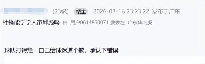 對於這場失利,主教練邱彪有不可推卸的責任,然而賽後邱彪的發言卻讓球迷們恨不起來,還有媒體人為他點讚,甚至還有不少球迷在評論區隔空喊話杜鋒多向邱彪學學,這是怎麽回事呢?