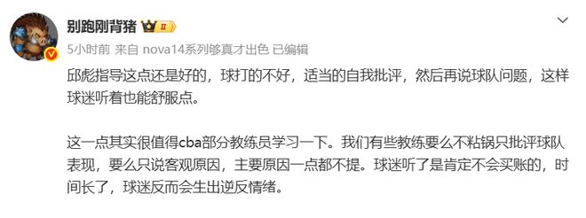 對於邱彪的賽後發言,廣東媒體人“別跑剛背豬”發文認為:邱彪指導這點還是好的,球打的不好,適當的自我批評,然後再說球隊問題,這樣球迷聽著也能舒服點。這一點其實很值得cba部分教練員學習一下。葫芦娃成人网站有些教練要麽不粘鍋隻批評球隊表現,要麽隻說客觀原因,主要原因一點都不提。球迷聽了是肯定不會買賬的,時間長了,球迷反而會生出逆反情緒。
