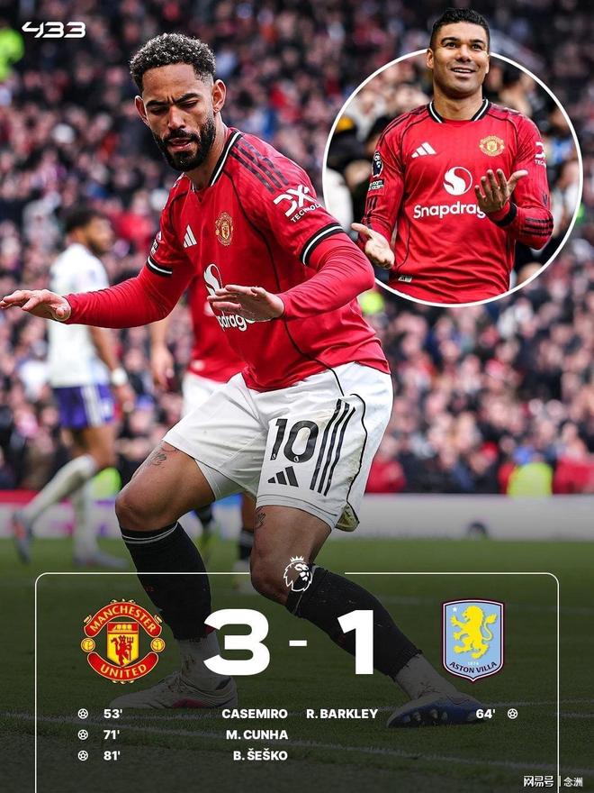 曼聯主場3-1戰勝阿斯頓維拉,穩居第3並擴大領先優勢。大馬丁屢次做出神撲,B費助攻卡塞米羅頭球打破僵局,巴克利扳平比分,B費再次助攻,庫尼亞破門,謝什科替補鎖定勝局。