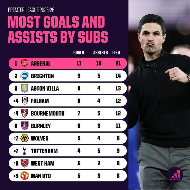 Opta列出了本賽季英超球隊替補球員參與進球榜,阿森納以21球居首,領先第二名的布萊頓7球。