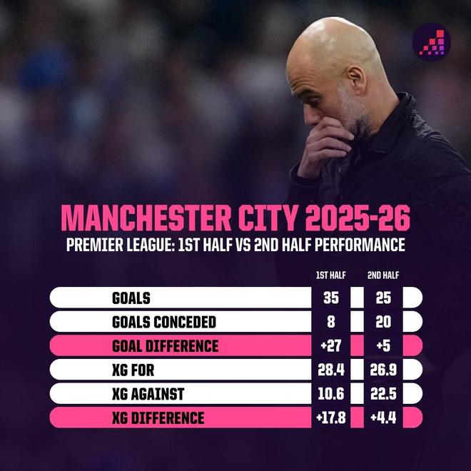 據Opta統計,若本賽季英超隻算上半場成績,曼城目前將以13分優勢領跑。